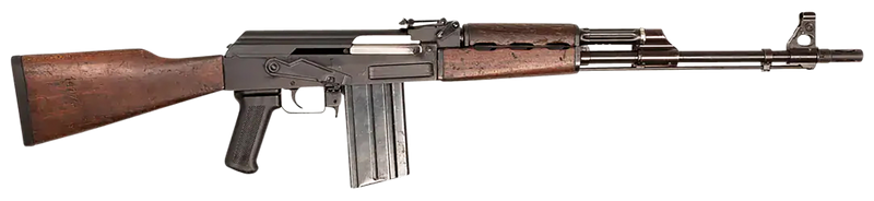 Semi-auto rifle chambered in .308 Winchester with a 19.65" threaded barrel and 20+1 capacity. Features a blued finish, fixed wood stock, wood handguards, black polymer grip, adjustable sights, and bayonet lug. Weighs 9.5 lbs and built on a milled receiver with mil-spec surplus components.
