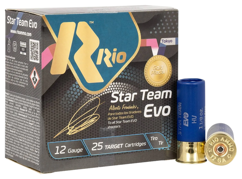 Rio Star Team EVO shotshells are loaded in 12 gauge with 2.75" casings, delivering 1 1/8 ounces of #7.5 shot per round. These 25-round boxes are designed for clay target shooting, sport clays, and general shotgun practice. Available in cases of 10 boxes.