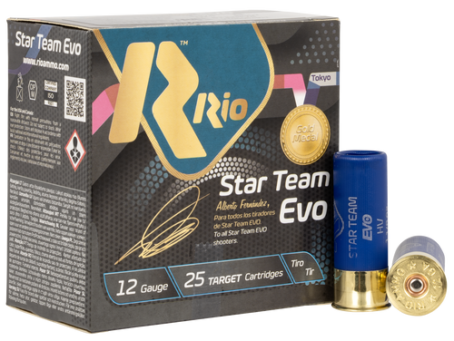 Rio Star Team EVO 12 gauge shotshells feature 2.75" casings loaded with 1 1/8 oz of #8 shot, delivering 1250 fps muzzle velocity. These lead shot rounds are designed for clay target shooting and sport competitions. Packed 25 rounds per box with 10 boxes per case.