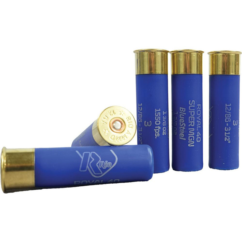 Rio Royal Blue Steel shotshells are 12 gauge, 3.5" magnum loads with 1 3/8 oz of #3 steel shot designed specifically for waterfowl hunting. These shells deliver 1550 fps velocity with perfectly round steel shot for reliable performance in adverse hunting conditions.