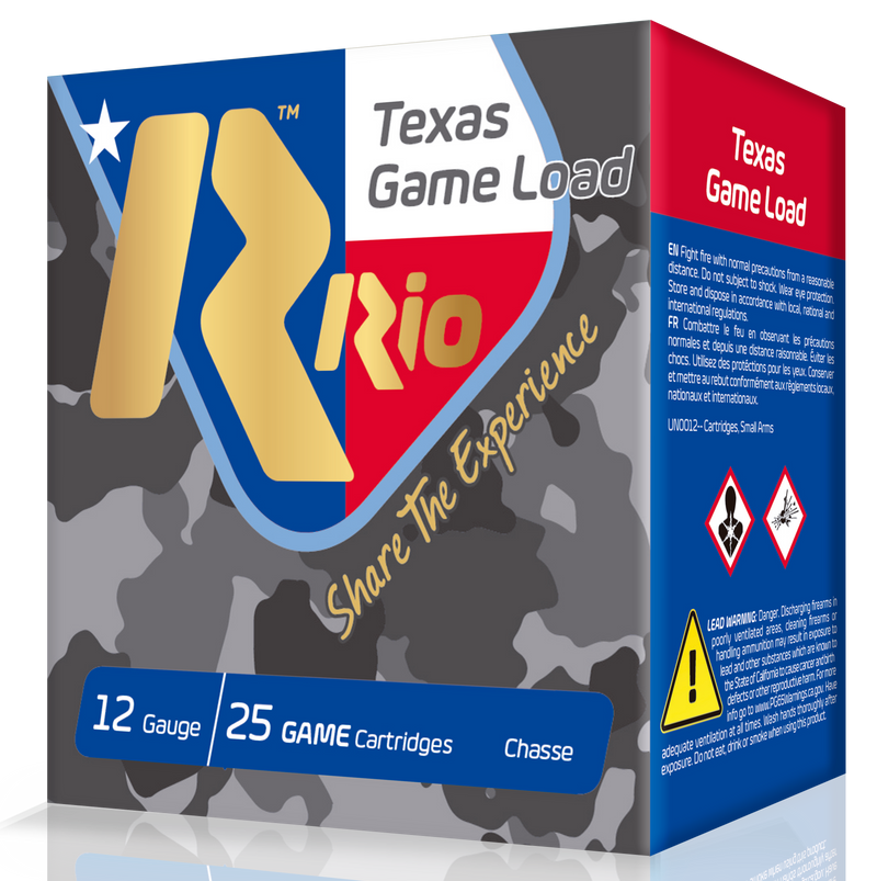 Rio Texas Game Load High Velocity shotshells in 12 gauge with 2.75" plastic cases and 1.25 oz of #6 lead shot. These shells deliver 1340 fps muzzle velocity and are designed for game hunting applications.