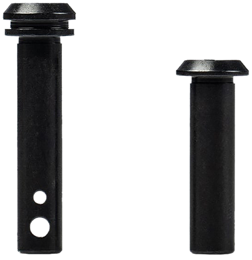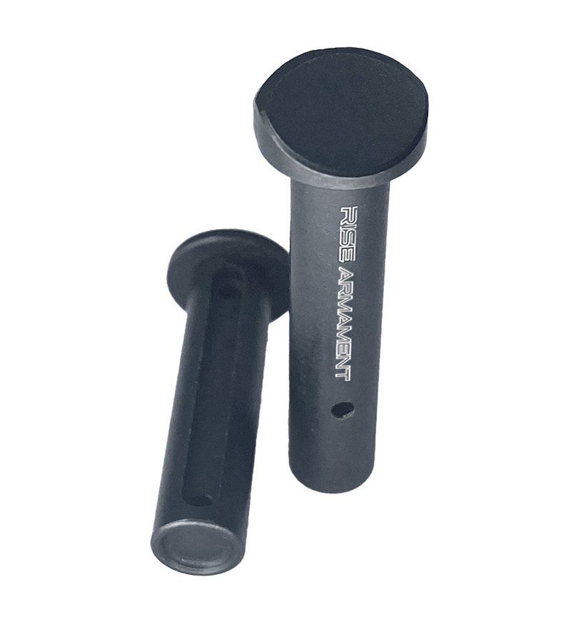 Rise Armament enhanced takedown and pivot pins for AR-15 rifles feature a concave and contoured face design for easy insertion and removal regardless of hand size or glove wear. The pins include a small cavity on the left side for quick extraction using a bullet tip or pen. Constructed from black nitride stainless steel for durability and corrosion resistance.