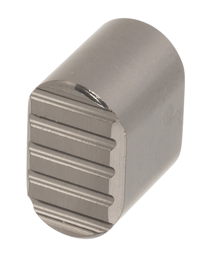 The Rise Armament RA010GPHT is an aluminum magazine release button designed for AR-15 platforms. Features a concave shape with horizontal slide-resistant grooves for secure, ergonomic operation. Finished in graphite gray anodized aluminum.