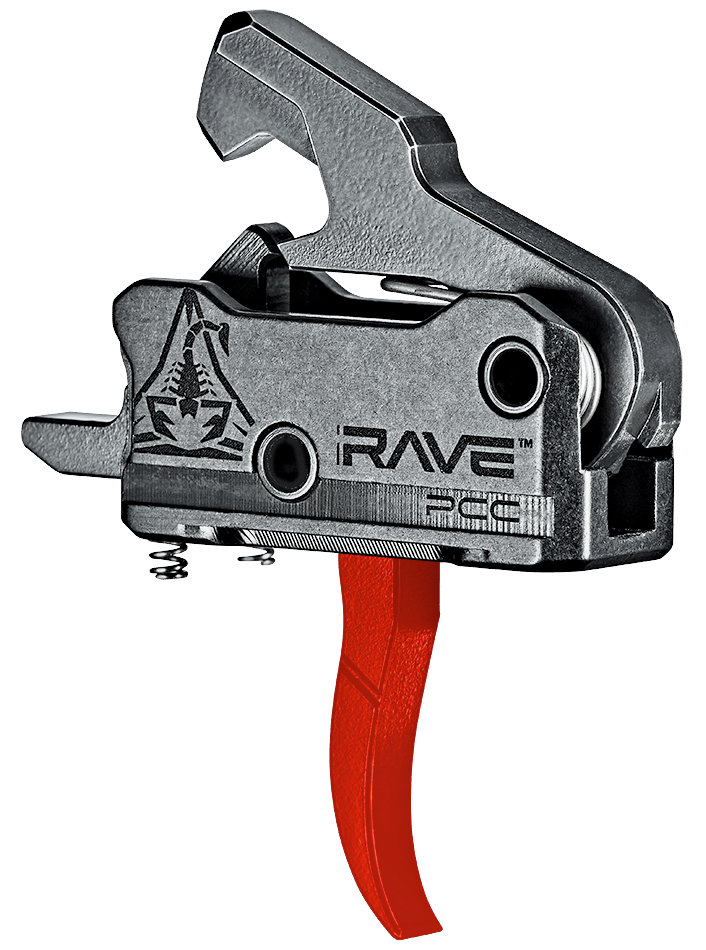 The Rise Armament Rave PCC is a single-stage curved trigger designed specifically for pistol caliber carbines (PCC) with a 3.5 lb pull weight and red nitride finish. Features an enhanced hammer engineered for reliable performance in AR-9 platforms and includes anti-walk pins. This budget-friendly trigger upgrade is constructed from aluminum and steel materials for durability in competition or self-defense applications.