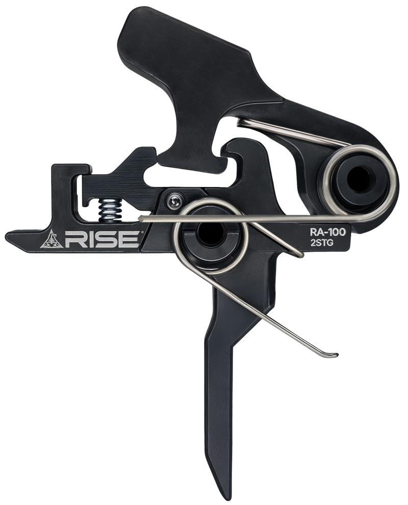 The Rise Armament RA-100F is a two-stage AR rifle trigger with a flat face design and 1.5-3 lb pull weight, engineered to outperform mil-spec triggers with smoother operation and greater precision. Constructed from steel with nitride finish for durability, it fits AR-15 and AR-10 platforms and includes mil-spec trigger and hammer pins for installation. The trigger features a forceful hammer spring that delivers reliable primer strikes even with steel-cased ammunition.
