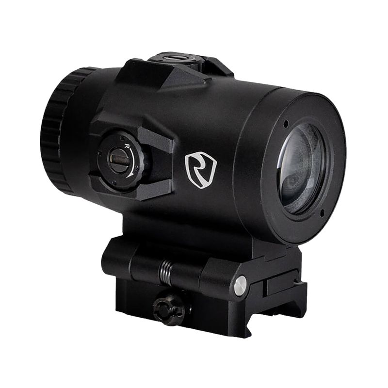 This is a 3x magnifier with a 22mm objective lens designed to pair with red dot and reflex sights. It features a quick-detach mount, spring-assisted 2-position design, and 2.75" eye relief. The magnifier works with Riton's RRD, ARD, and PRD optics for enhanced target acquisition.
