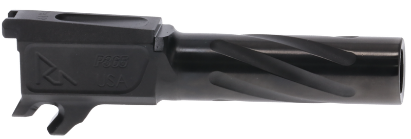 Drop-in precision match grade barrel for Sig P365 in 9mm Luger with 3.10" length and 1:10" twist rate. Features fluted design, threaded muzzle, target crowned finish, and black PVD steel construction for durability and corrosion resistance.