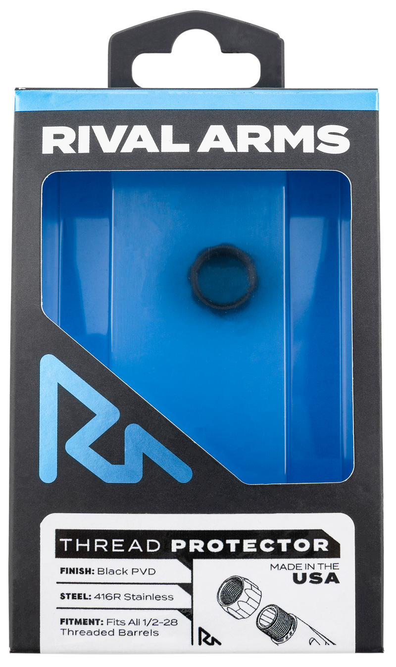 Rival Arms thread protector designed for 9mm Luger firearms with 1/2"-28 tpi threaded barrels. Constructed from 416R stainless steel with black PVD coating for corrosion resistance and durability. Simply threads onto the barrel to protect threads when a suppressor or muzzle device is not in use.