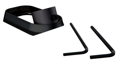 This two-piece magwell is designed for Glock Gen5 models 17, 22, 34, and 35. Constructed from black anodized aluminum, it features a precision-fit design to enhance magazine insertion and removal. Dimensions are 4.6" length x 3.0" width x 1.6" height.