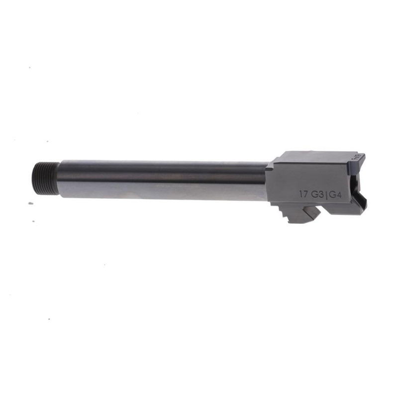 Match-grade precision drop-in barrel for Glock 17 Gen3/4 chambered in 9mm Luger, machined from 416R stainless steel with low-temperature vacuum PVD coating for corrosion resistance and durability. Features a 4.95" barrel with 1/2-28 muzzle threads, 1:10 twist rate, and target crowned muzzle. No gunsmith required for installation and includes a limited lifetime warranty.