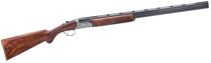 This Rizzini USA 410 Gauge break-action shotgun features a 29" ventilated rib barrel with 2-round capacity and single selective trigger. The coin anodized silver receiver pairs with a Grade III Turkish walnut stock featuring Prince of Wales grip, and includes 5 flush chokes for versatile shooting.