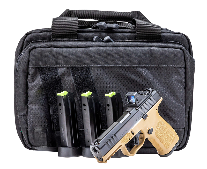 The Rost Martin RM1C is a 9mm semi-automatic striker-fired compact pistol with a 4" barrel and 17-round capacity, featuring a nitrocarburized finish and flat dark earth polymer frame. This Range Ready Package includes an optic-ready slide with RMR mounting plate, Viridian green dot sight, iron sights, five magazines (four 17-round and one 15-round), and a Savior Specialist pistol bag. Dimensions are 4.5" height, 14.2" length, and 12.5" width with textured grips for ergonomic control.