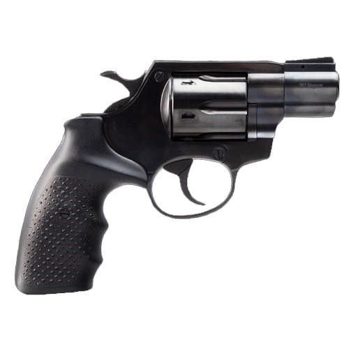 A medium-frame .357 Magnum revolver with a 2-inch stainless steel full shroud barrel and double/single-action trigger. Features a 6-round cylinder, exposed hammer, transfer bar safety, and black finger-grooved rubber grips. Weighs 27.52 oz with an overall length of 6.75 inches.