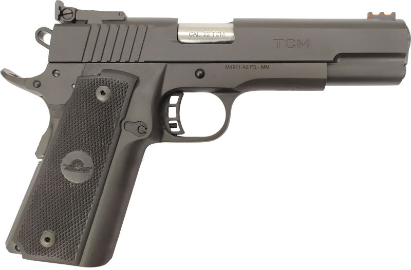 Single-action semi-auto pistol chambered in 22 TCM with a 5" barrel and 17+1 round capacity. Features a steel frame with black parkerized finish, beavertail safety, serrated slide, and fiber optic front sight with adjustable rear sight. Built on a 1911-style platform with 4140 ordnance steel construction.
