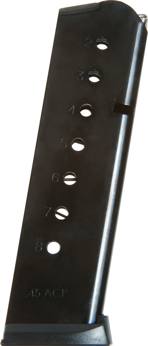 This .45 ACP magazine holds 8 rounds and is designed to fit Rock Island Armory 1911 pistols in both full-size and mid-size configurations. The magazine features a steel body with steel base plate and blued finish for durability and reliable feeding.