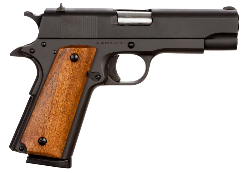 Semi-automatic 1911-style pistol chambered in 45 ACP with a 4.2" barrel and 8+1 capacity. Features a steel frame with parkerized finish, fixed sights, wood grips, beavertail frame, and serrated slide. Weighs 43.6 oz and is compliant with CA, MD, and MA regulations.