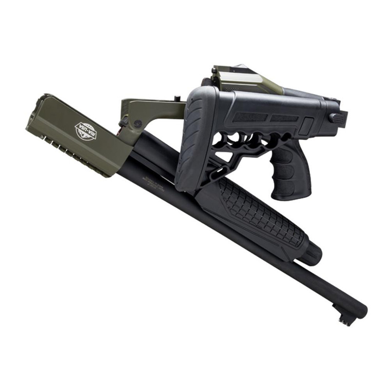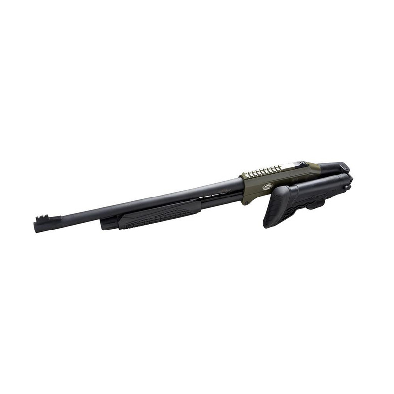The RIA-USA Pak Out is a 12-gauge pump-action shotgun with an 18.5" barrel and 4+1 shell capacity, chambered for 3" shells. This American-made firearm features a spring-assisted pump action with a telescoping/folding stock, measuring just 26 inches when folded and 37.25 inches unfolded for portability. It includes fixed sights, synthetic furniture, and a Picatinny rail for accessories.