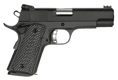 Semi-automatic 1911-style pistol chambered in 9mm Luger with a 4.25" barrel and 8-round capacity. Features an officer-grip aluminum frame paired with a commander-length slide, fiber optic front sight, and adjustable rear sight with a crisp 4-6 pound trigger. Weighs 1.85 lbs and measures 8" in length, making it suitable for concealed carry.