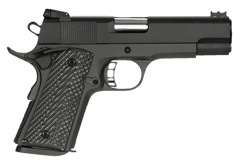 The Rock Ultra CCO is a single-action semi-automatic pistol chambered in .45 ACP with a 4.25" button-rifled barrel and 7+1 capacity. It features a compact Officer-sized aluminum frame paired with a Commander-length steel slide, fiber optic front sight and adjustable rear sight, skeletonized trigger and hammer, and ambidextrous thumb safety for concealed carry. The pistol includes a full-length guide rod and comes with G10 tactical grips and one 7-round magazine.