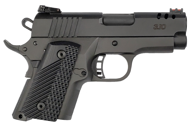 Semi-auto 1911-style compact pistol chambered in 9mm Luger with a 3.1" barrel and 10+1 capacity. Features a black parkerized steel slide and frame, fixed sights, G10 grips, and beavertail grip safety. Weighs 1.62 lbs loaded with an overall length of 6.85 inches.
