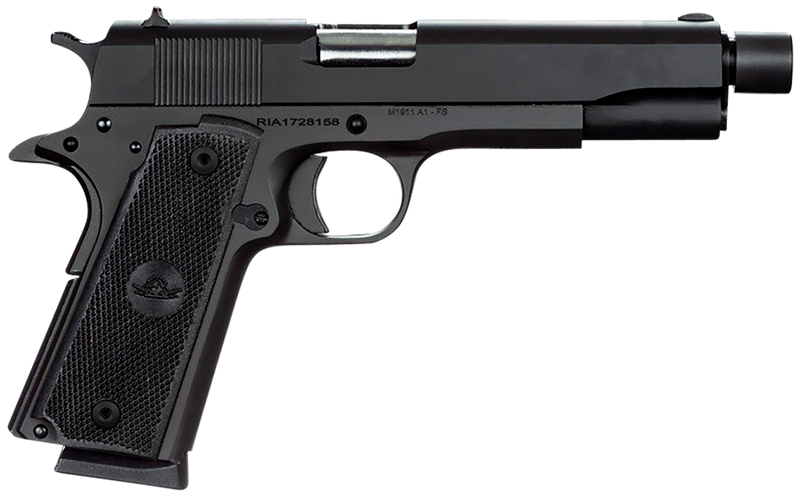 Semi-automatic 1911-style pistol chambered in .45 ACP with a 5" threaded barrel and 8+1 round capacity. Features a parkerized finish steel frame, beavertail safety, fixed low-profile sights, serrated slide, and black rubber grips. Weighs 39.5 oz and measures 12.3" overall length.