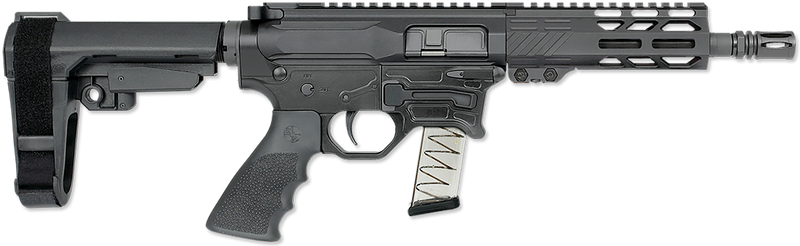 Rock River Arms LAR-BT9G is a semi-auto 9mm Luger pistol with a 7" threaded barrel and 15+1 capacity. Features M-LOK handguard, Picatinny rail receiver, SB Tactical SBA3 arm brace, and Hogue rubber grip. Overall length 26", weighs 5.40 lbs.