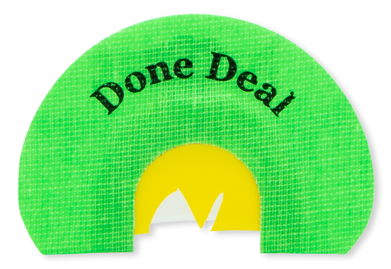 The Rolling Thunder Done Deal is a 3-reed diaphragm game call designed to attract turkey species. This hands-free call features a combo cut design and measures 3.6" x 3.6" x 0.4", making it portable for hunting applications.