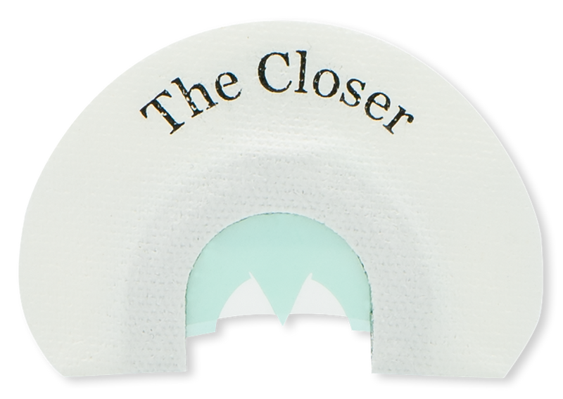 The Closer is a 2-reed diaphragm game call designed to attract turkey species. This hands-free call features a bat wing cut design and measures 3.6" x 3.5" x 0.4". It is ideal for turkey hunting applications where a compact, portable call is needed.