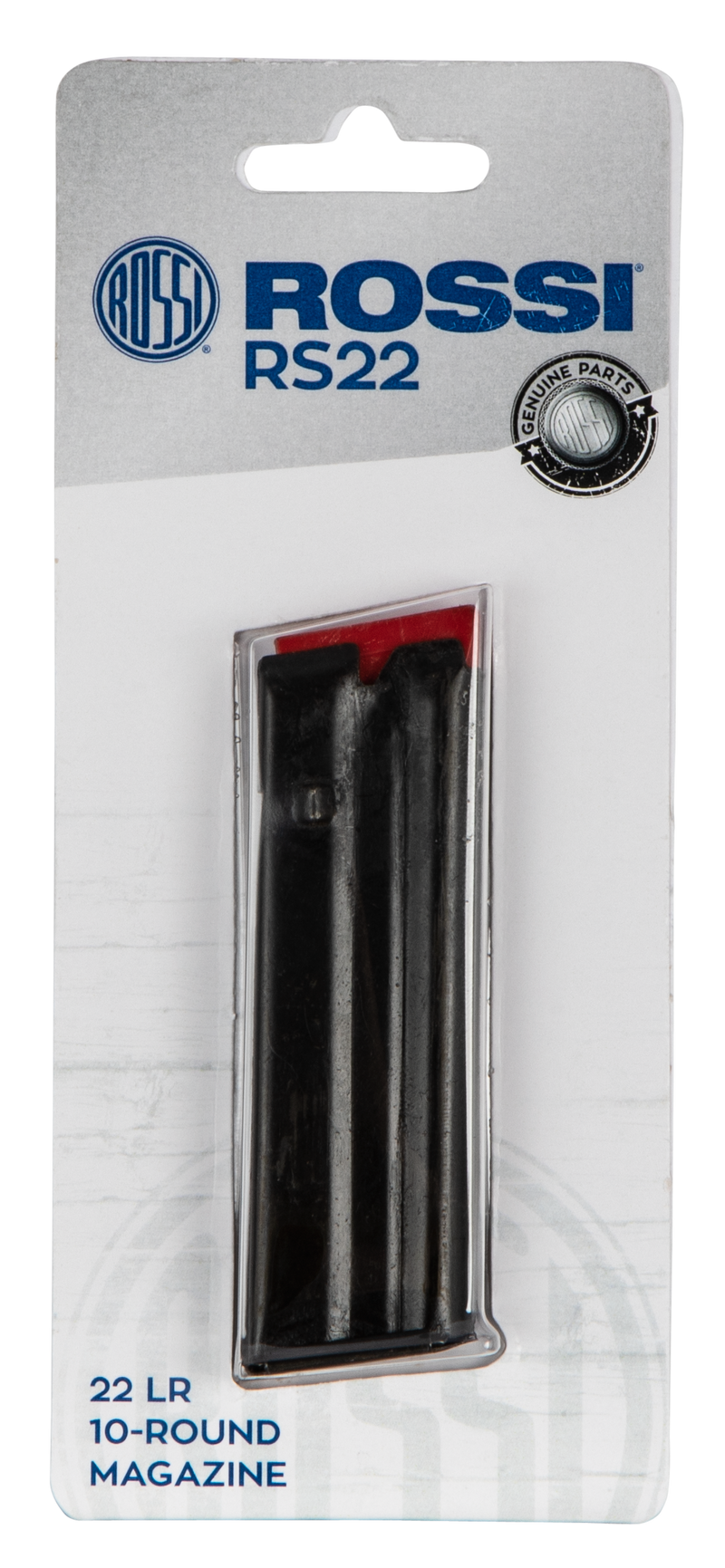 OEM replacement magazine for Rossi RS22 semi-automatic rifles chambered in .22 LR with 10-round capacity. Features a steel body with polymer follower and black finish. Detachable type magazine designed for reliable feeding and durability.