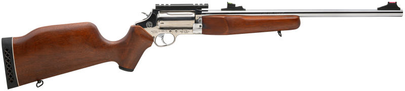 The Rossi Circuit Judge is a double/single action rifle chambered in 45 Colt and 410 gauge with an 18.5" stainless steel barrel and 5-round capacity. Features adjustable fiber optic sights, transfer bar safety, contoured Monte Carlo hardwood stock, and is drilled and tapped for scope mounting. Weighs 5.2 lbs with an overall length of 35.6".