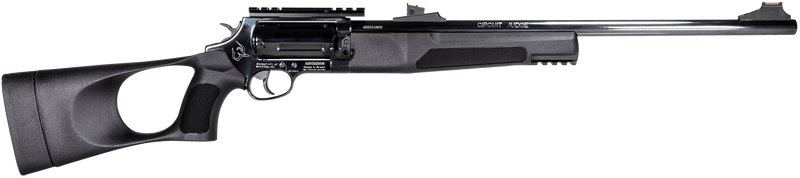 The Rossi Circuit Judge is a double/single action rifle chambered in 45 Colt and .410 gauge (3" chamber) with an 18.5" barrel and 5-round capacity. Features include adjustable fiber optic sights, transfer bar safety, synthetic thumbhole stock, and drilled/tapped for optics. This versatile hunting rifle weighs approximately 4.7 lbs and measures 31.8" overall.