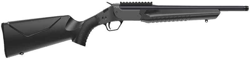 The Rossi LWC is a single-shot, break-action rifle chambered in .44 Magnum with a 16.5" threaded barrel and black oxide finish. It features a steel receiver with aluminum Picatinny rail, fixed black synthetic stock, and weighs approximately 5.2 lbs, making it a compact option for hunting and handgun-caliber target shooting.