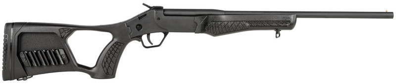 The Rossi Tuffy SSP1-BK is a break-action single-shot shotgun chambered in .410 Bore with a 3" chamber and an 18.5" matte black barrel. It features a matte black steel receiver, black synthetic thumbhole stock with integrated shell holders, and a transfer bar safety. Weighing approximately 2.95 lbs with an overall length of 31", this compact lightweight shotgun is designed for youth and small-frame shooters, making it ideal for farm, camp, or truck gun use.