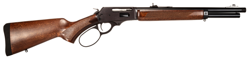 The Rossi R95 Trapper is a compact lever-action rifle chambered in .45-70 Government featuring a 16.5" threaded black oxide barrel with 5+1 round capacity. It includes a drilled and tapped stainless steel receiver, fixed hardwood walnut stock, adjustable buckhorn rear sight with drift-adjustable front sight, and weighs 6.70 lbs. The hand-finished lever action and hammer-forged barrel make this an ideal choice for hunters seeking a reliable, smooth-operating rifle.