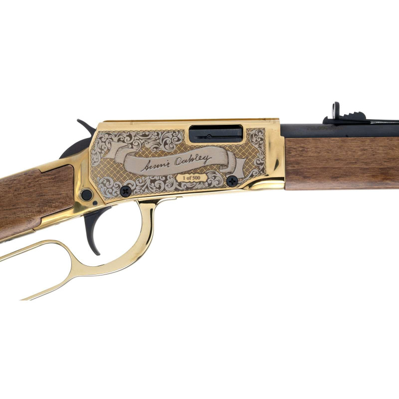 The Rossi Rio Bravo is a .22 LR lever-action rifle with an 18" barrel and 15-round capacity, featuring an Annie Oakley limited edition engraved design with gold PVD finish. It includes drift-adjustable front sights and adjustable buckhorn rear sights, with a wood stock and weighs 5.17 lbs unloaded. Overall length is 35.9" with a 1:16" right-hand twist rate and 6 grooves.