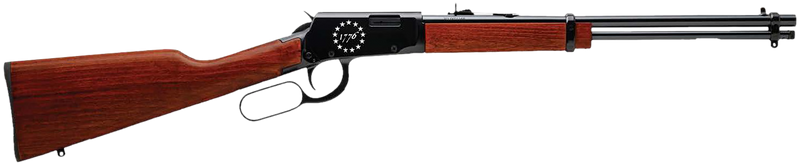 The Rossi Rio Bravo is a .22 LR lever-action rifle featuring an 18" polished black alloy steel barrel with a 15+1 round capacity. It includes a fixed hardwood stock, buckhorn sights with dovetail rail, and custom engraving with "1776" stars on the receiver. This right-hand rifle weighs 88 oz and has an overall length of 35.90".