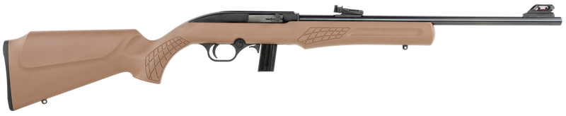 Semi-automatic rimfire rifle chambered in .22 LR with an 18" free-float barrel and 10+1 capacity. Features fully adjustable fiber optic front and rear sights, synthetic Monte Carlo stock in coyote brown, matte black receiver, and 3/8" dovetail scope mount receiver. Weighs approximately 4.1-5.3 lbs with an overall length of 36.25".