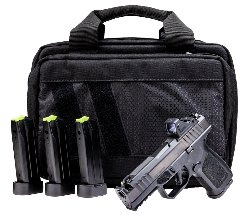 Semi-automatic striker-fired compact pistol in 9mm Luger with a 4" integrally compensated barrel and 17+1 capacity. Features polymer frame, fixed iron sights, optic-ready RMR plate, and includes Viridian RFX-11 green dot reflex sight. Bundle includes 4 total magazines (one 15rd and three 17rd) and Savior Specialist pistol case.