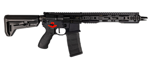 Semi-auto rifle chambered in 300 AAC Blackout with an 11.5" NRS straight cut barrel and 30+1 round capacity. Features a Binary Elite Trigger, Magpul SLK collapsible stock, Ergo grip, and hardcoat anodized aluminum upper and lower receivers. Non-NFA compliant design with no sights.