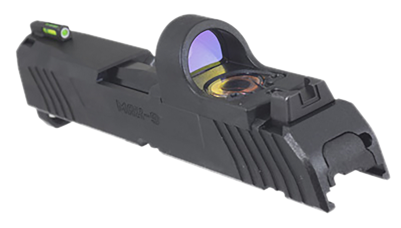 Complete slide assembly for Ruger Max-9 pistols, featuring an integrated ReadyDot micro reflex red dot sight pre-installed. Includes 4" barrel, extractor, sights, and all necessary slide components with black oxide finish. Turnkey design simplifies installation with included instructions.