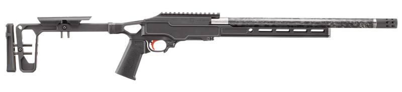 Semi-automatic .22 LR rifle with 16.1" carbon fiber barrel featuring a 1:16" RH twist and threaded muzzle (1/2x28). Includes grey birch chassis stock with modular 10" forend with M-LOK and Arca-Swiss compatibility, adjustable for length of pull and cheek height. Hard-coat anodized aluminum receiver, 30 MOA Picatinny rail, Ruger BX-Trigger, weighs 4.2 lbs, and ships with one 10-round magazine.