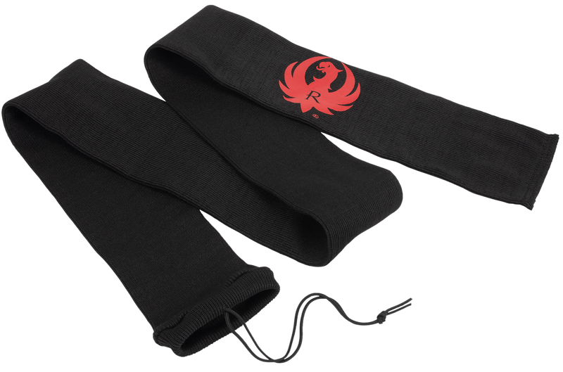 The Ruger Gun Sock is a 52-inch protective sleeve designed to fit most rifles and shotguns with or without scopes. Constructed from silicone-treated knit fabric that resists moisture, it features a drawstring cinch closure and red Ruger silkscreened logo for easy identification.