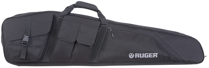 The Ruger Defiance Tactical Rifle Case is a 42-inch long tactical rifle case constructed with durable Endura material and features a full-length lockable zipper for secure transport. It includes a padded knit lining, carry handle, magazine pocket, and multiple accessory pockets for organized storage of gear and accessories.