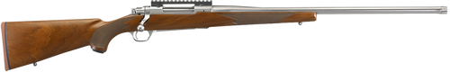 The Ruger Hawkeye is a full-size bolt-action rifle chambered in 30-06 Springfield with a 22" satin blued barrel and integral scope mount receiver. It features an American walnut fixed stock, LC6 trigger, and 4+1 capacity, weighing 7.50 lbs and designed for hunting and target shooting.