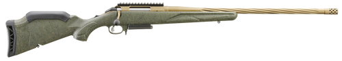 The Ruger American Gen II Predator is a bolt-action rifle chambered in .270 Winchester with a 22" spiral-fluted, threaded barrel finished in Burnt Bronze Cerakote. It features a 4+1 round capacity, Picatinny scope rail, adjustable length-of-pull green splatter synthetic stock, and weighs 6.6 lbs. The rifle includes a soft rubber recoil pad and manual safety for reliable field performance.