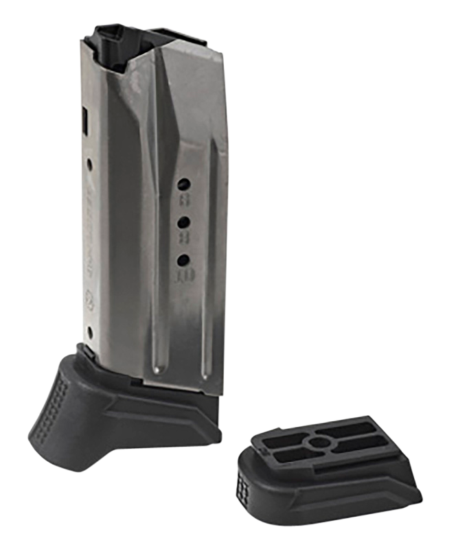 This is a genuine Ruger factory magazine for the American Pistol Compact chambered in 9mm Luger with a 10-round capacity. The magazine features nickel-Teflon plated steel construction and comes with both an extended floorplate and a flush floorplate for versatile carry options.