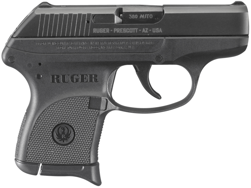 The Ruger LCP is a double-action-only semi-automatic pistol chambered in .380 ACP with a 2.75" barrel and 6+1 round capacity. It features a black oxide alloy steel slide with serrated top, black polymer frame, and fixed sights, weighing 9.4-9.6 oz for lightweight concealed carry. Includes one magazine and soft case.