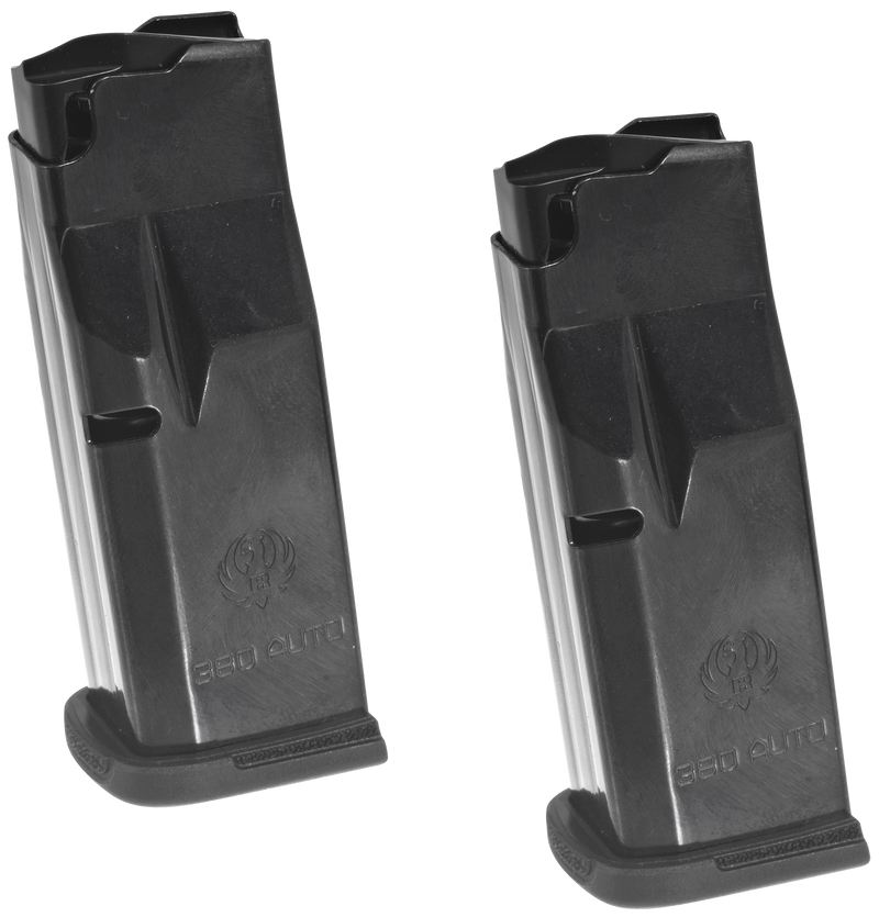 These are genuine Ruger factory magazines chambered in .380 ACP with 10-round capacity, designed to fit the Ruger LCP MAX pistol. Constructed from blued steel with a black finish, each 2-pack includes flush-fit floorplates and extended floorplates for versatile carry options.