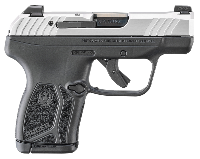 The Ruger LCP Max is a semi-automatic pistol chambered in .380 ACP with a 2.8-inch black oxide barrel and 10+1 round capacity. It features a matte stainless steel serrated slide with polished sides, black polymer frame with textured grip, and manual safety lever. The compact 9.2-inch length and lightweight profile make it ideal for concealed carry.
