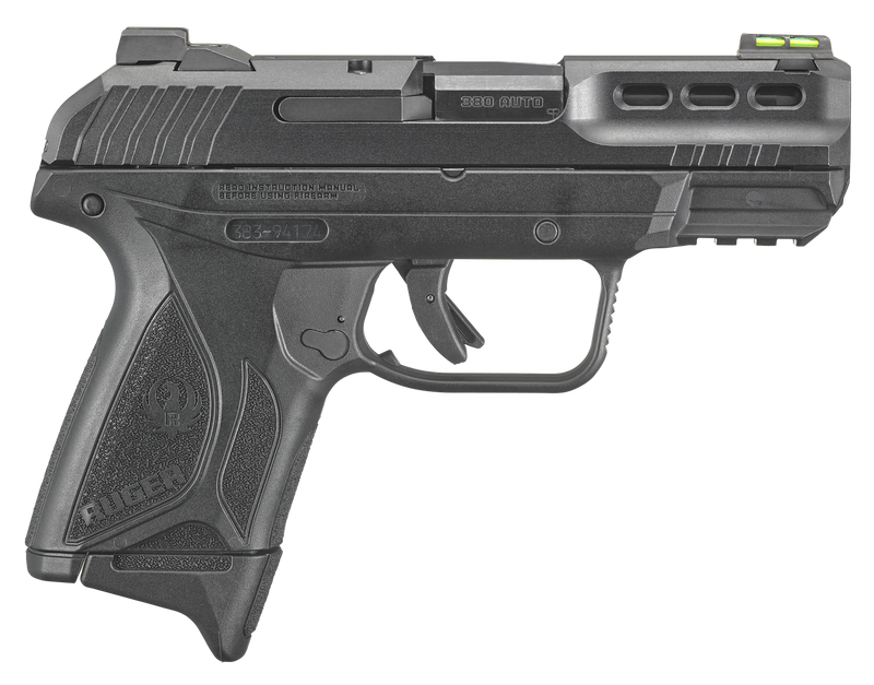 The Ruger Security-380 is a striker-fired semi-automatic pistol chambered in .380 ACP with a 3.42" barrel and 10+1 round capacity. It features a lightweight polymer frame with accessory rail, fiber optic front sight and drift-adjustable rear sight, and Ruger's Lite Rack system for easier slide manipulation. The gun weighs 19.7 oz and measures 6.52" overall length, making it compact for concealment while remaining comfortable to shoot.